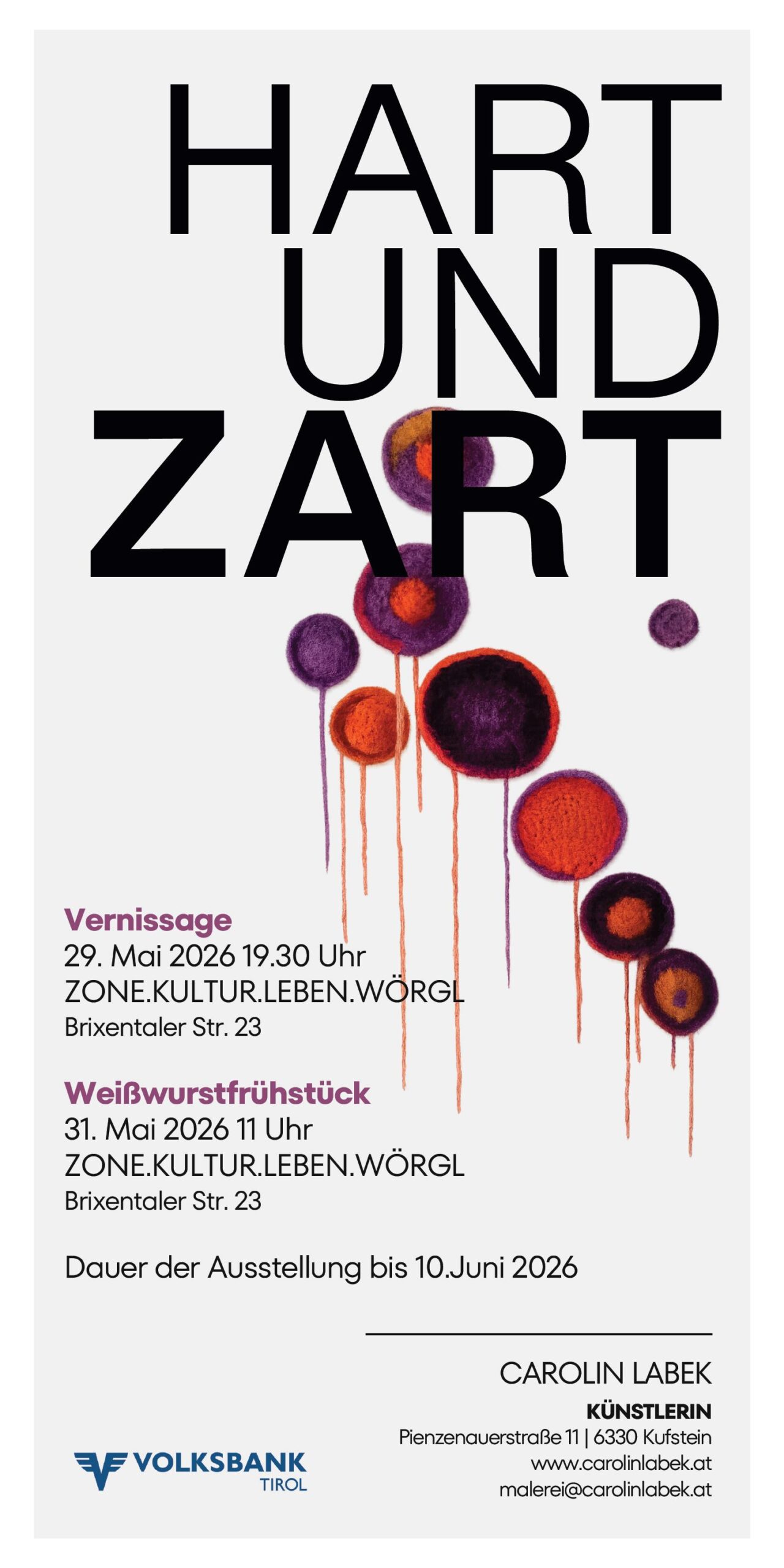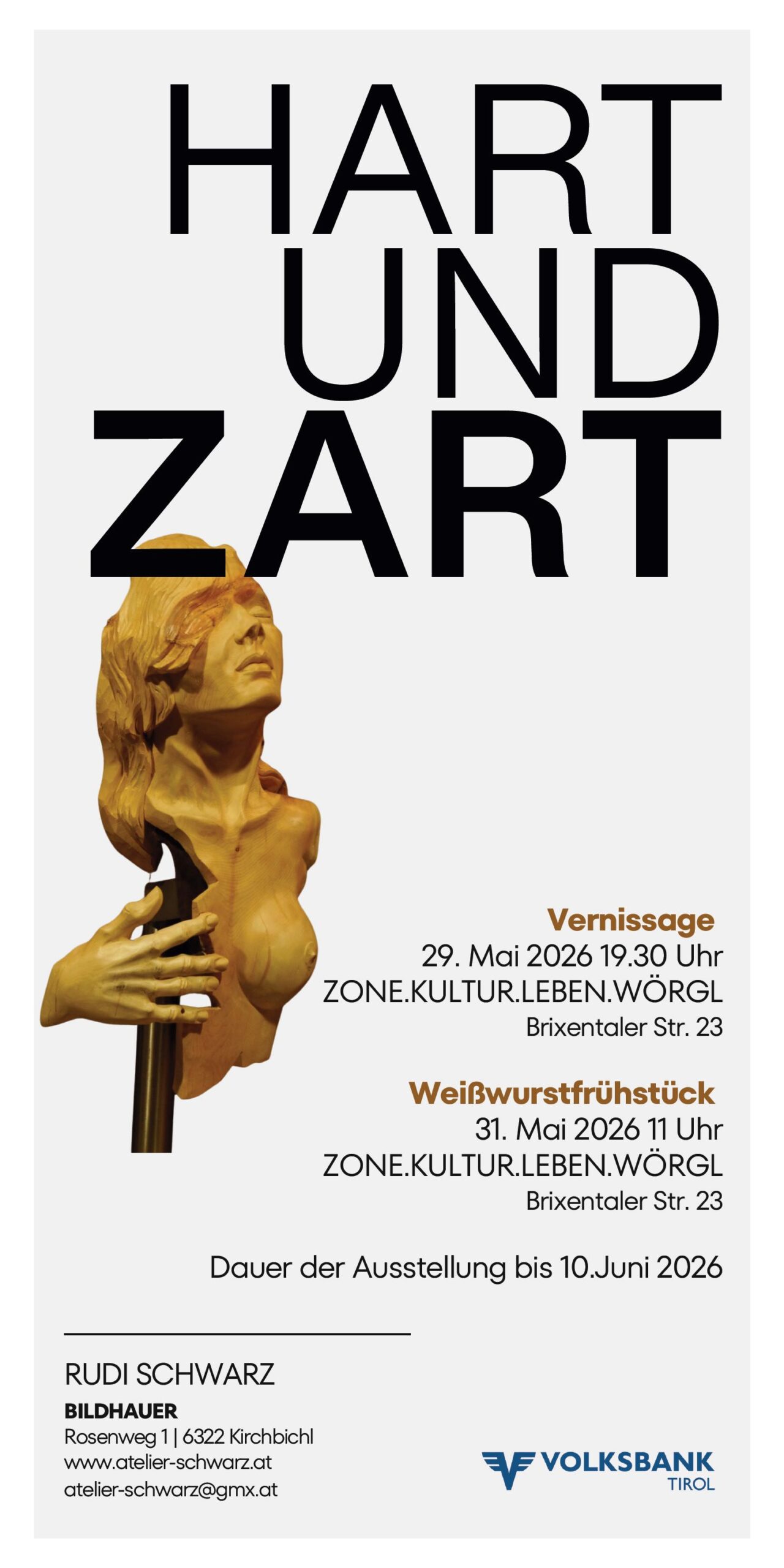 29. Mai 2026 VERNISSAGE Carolin Labek & Rudi Schwarz “ZART&HART” ZONE Wörgl – 31.Mai 11 Uhr Weißwurstfrühstück – Zone Wörgl Brixentalerstraße 23